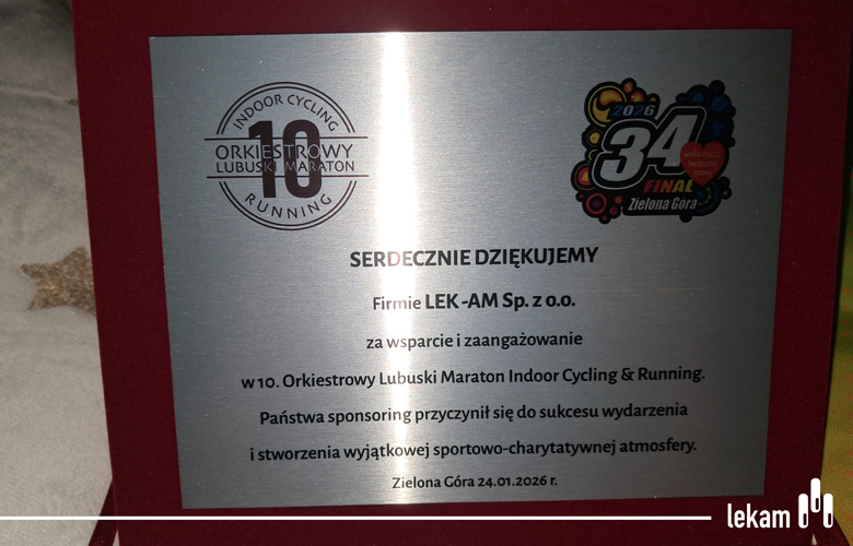 24 stycznia w hali Centrum Rekreacyjno-Sportowego w Zielonej Górze odbył się X Orkiestrowy Lubuski Maraton Indoor Cycling & Running. Po 5 godzinach intensywnych zmagań uczestnicy mogli wspólnie cieszyć się z rekordowego wyniku zbiórki. W tym roku w Lubuskim Maratonie wzięło udział blisko 300 uczestników, w tym 200 rowerzystów i 100 biegaczy. Wspierając wydarzenie LEK-AM przygotował dla sportowców pakiety startowe. Dzięki zaangażowaniu naszej Przedstawicielki Medycznej kolejny raz firma była obecna na finale WOŚP w Zielonej Górze. Wyrazy uznania składamy wszystkim uczestnikom zbiórki na rzecz zapewnienia najwyższych standardów diagnostyki i leczenia chorób przewodu pokarmowego u najmłodszych dzieci.