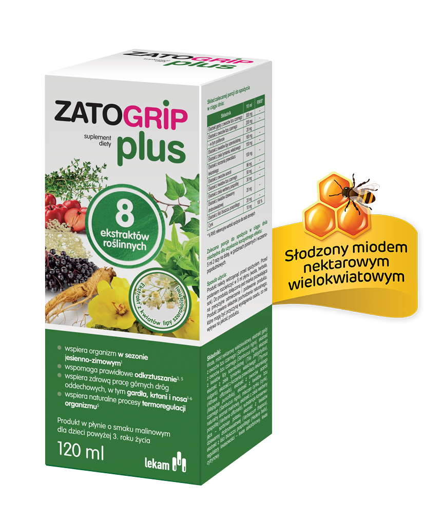ZATOGRIP PLUS wspiera prawidłowe funkcjonowanie układu oddechowego – w tym nosa, gardła i krtani – oraz układu odpornościowego.